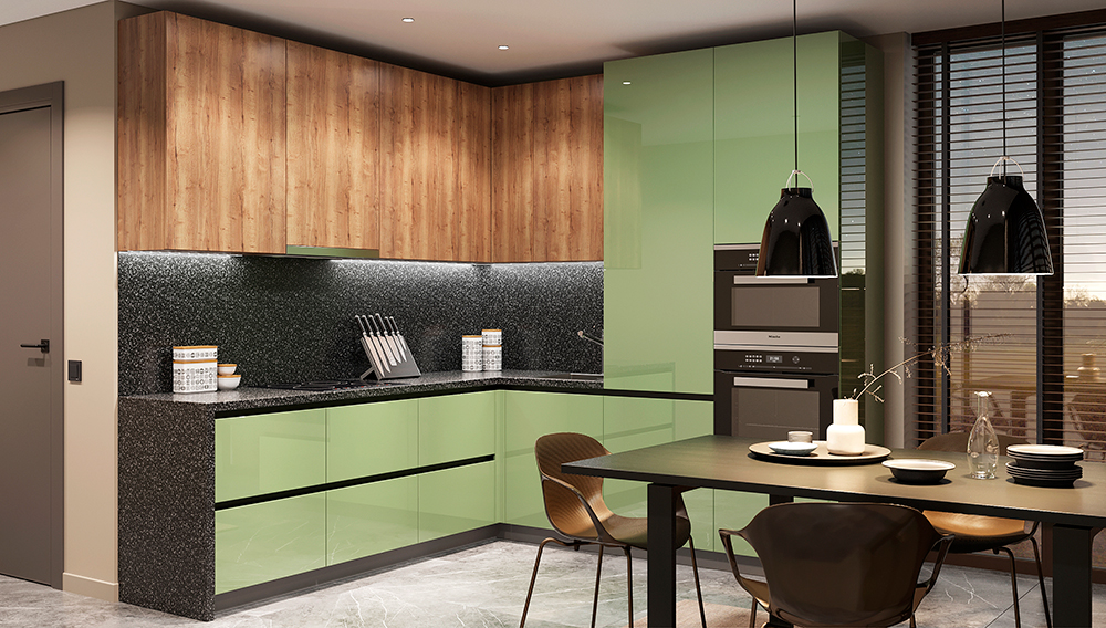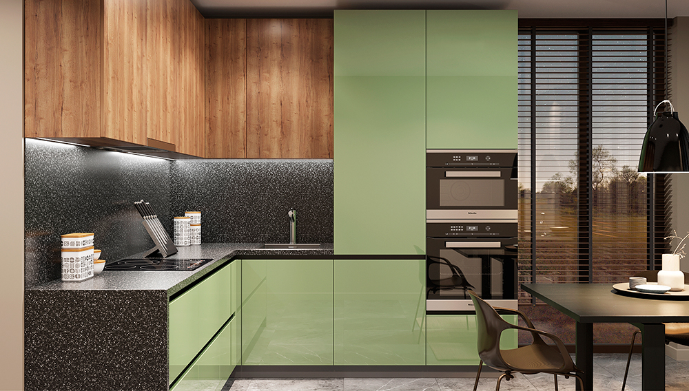 Кухня крутая, верно? Модные сочетания цветов, экологичный софт, скрытые ручки Gola, и каменная столешница, переходящая в боковину. А зачем, спросите вы? Ну как зачем, чтобы все ахнули!