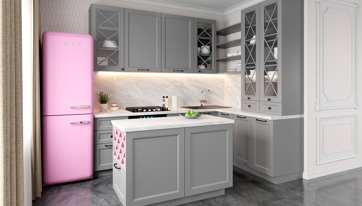 Вашему вниманию - обаятельный проект. Кухня окрашена в серый тон, однако выглядит ярко и привлекательно. Чтобы добиться такого вау-эффекта, нужен дизайнерский опыт, и он есть у менеджеров М:32. Они поделятся с вами милыми фишечками, и это будет для вас бесплатно при заказе 3Д проекта.