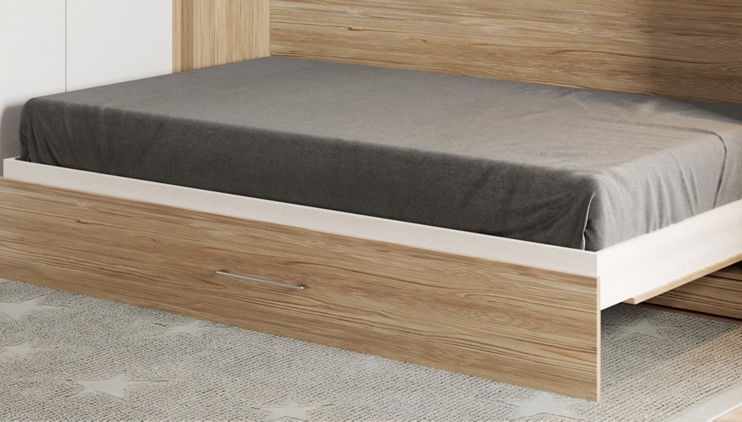Не так часто, но мы принимаем заказы с горизонтальными откидными кроватями. Такая раскладная кровать идеальна для школьника, она компактна и освобождает место для стола. Родителям не о чем беспокоиться, если вы вовремя позаботились о ребенке и заказали детский уголок: шкаф, кровать с антресолями и рабочий столик.